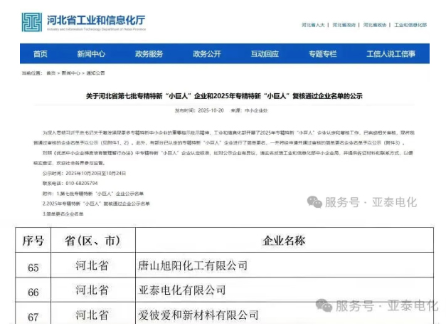 近日,河北省工業(yè)和信息化廳發(fā)布關(guān)于河北省第七批專精特新“小巨人”企業(yè)和2025年專精特新“小巨人”復(fù)核通過的企業(yè)名單,亞泰電化有限公司作為第四批認(rèn)定的專精特新“小巨人”企業(yè),憑借在細(xì)分領(lǐng)域的不斷積累與持續(xù)創(chuàng)新能力,順利通過2025年專精特新“小巨人”企業(yè)復(fù)核認(rèn)定。此次復(fù)審?fù)ㄟ^,標(biāo)志著公司在專業(yè)化發(fā)展、技術(shù)創(chuàng)新實(shí)力與未來成長潛力方面獲得了長足的進(jìn)步,即是對企業(yè)以往成績的肯定,也是對未來企業(yè)發(fā)展的鞭策。